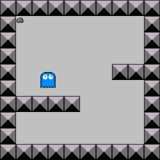 Voilà un screen (exagéré bien sûr) de ce à quoi peut ressembler un jeu baclé, avec des sprites trouvés ailleurs. L'auteur a peut être trouvé classe les blocs, peut être parce qu'ils apportent un relief, ils pourraient être pire avec juste un contour noir et une couleur unie au centre. Le personnage ou ennemi, enfin ce que vous voulez, a un sprite de fantôme tout fait, qui lui aussi peut être amélioré. Le fond est vide, à la rigueur il n'y a que les graphismes essentiels au jeu, mais pas de background ou tile qui apporte une atmosphère, cela est vide et monotone.