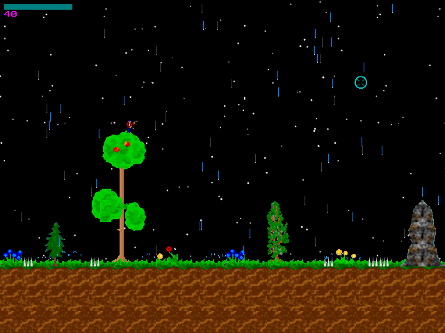Visuellement, c'est déjà une autre paire de manches. Les sprites et autres textures sont de bonne facture, et en fait plutôt jolis en étant observés individuellement. Seulement voila: même si cela ne saute pas forcément aux yeux, les graphismes sont un gros mélange d'éléments faits maison et de ressources trouvés ça et là, venant de plusieurs graphistes de styles et de techniques différentes. Résultat: gros manque de cohérence, et même si l'ensemble peut paraître correct, il suffit de fouiller un tantinet pour se rendre compte que ce petit monde ne tient pas en place. Évidemment, ce n'est pas laid, d'ailleurs quelques effets dynamiques viennent remonter le tout en insufflant un peu de vie, comme la pluie ou les éclairs; vous aurez également l'occasion de distinguer divers thèmes de décors et ambiances. C'est parfaitement jouable, mais à condition de rester un minimum tolérant(e)*.